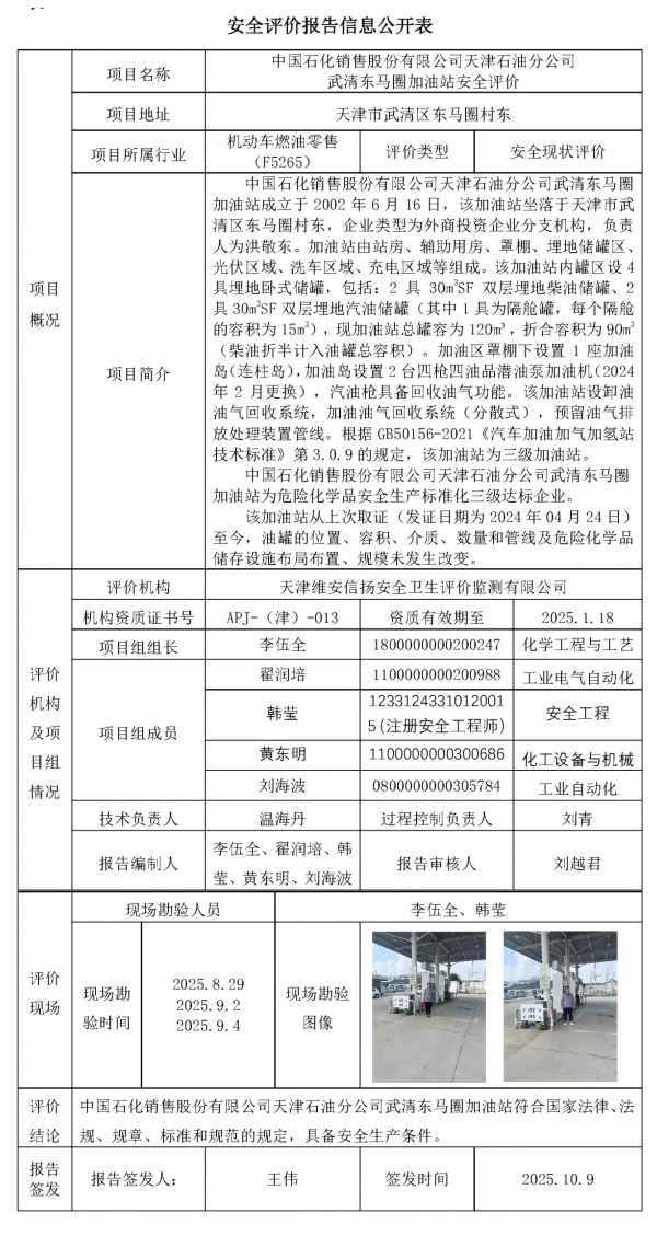 中国石化销售股份有限公司天津石油分公司武清东马圈加油站安全评价